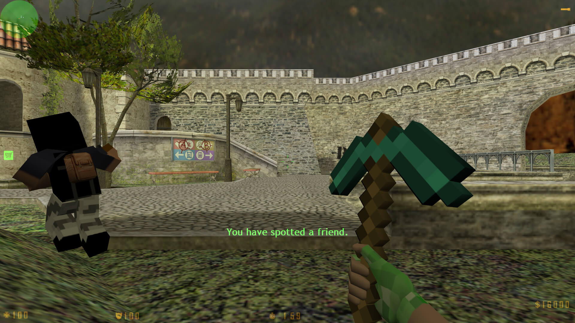 Your heads-up display gets the full treatment too. Icons for ammo, health, and cash are now chunky Minecraft symbols - swords for knives, chests for buy menu. Fonts? Bold, pixel-perfect, easy to read even in 4:3 stretched glory.